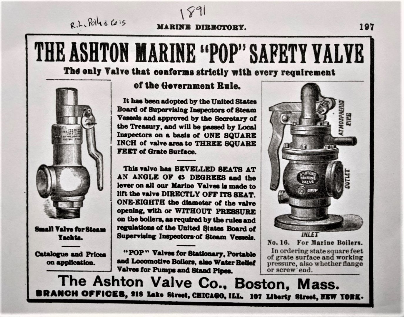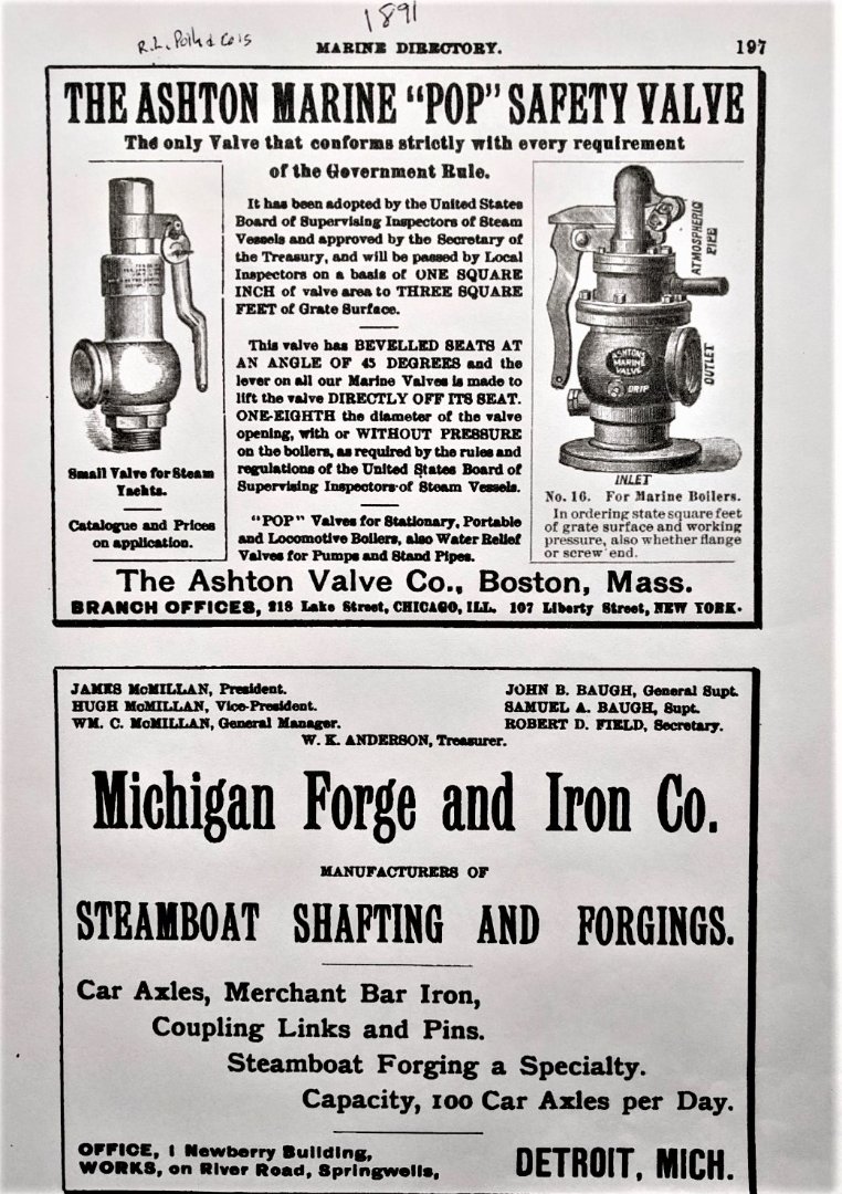 Way back in 1871, my great great grandfather Henry Ashton invented a pop safety valve that was the first in the "age of steam" to actually work well. I would like to think his invention saved many lives and the popularity of his invention proved it's importance in the effort to make boilers of all kinds safer to work with. I am going to tell the history of the company and how it related to steam ships, locomotive, and boiler rooms. There is a good chance one of the readers might have an Ashton gauge, safety valve, or whistle on your boat now. check out the story of the company. I hope you find it interesting.