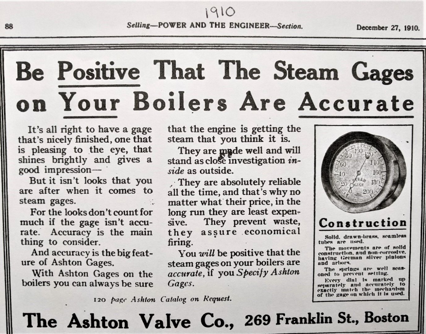 In 1892 Ashton bought out the Boston Steam Gauge company and entered the steam gauge market. The Ashton Valve company is more known today for the gauges than the safety valves that made the company initially famous.