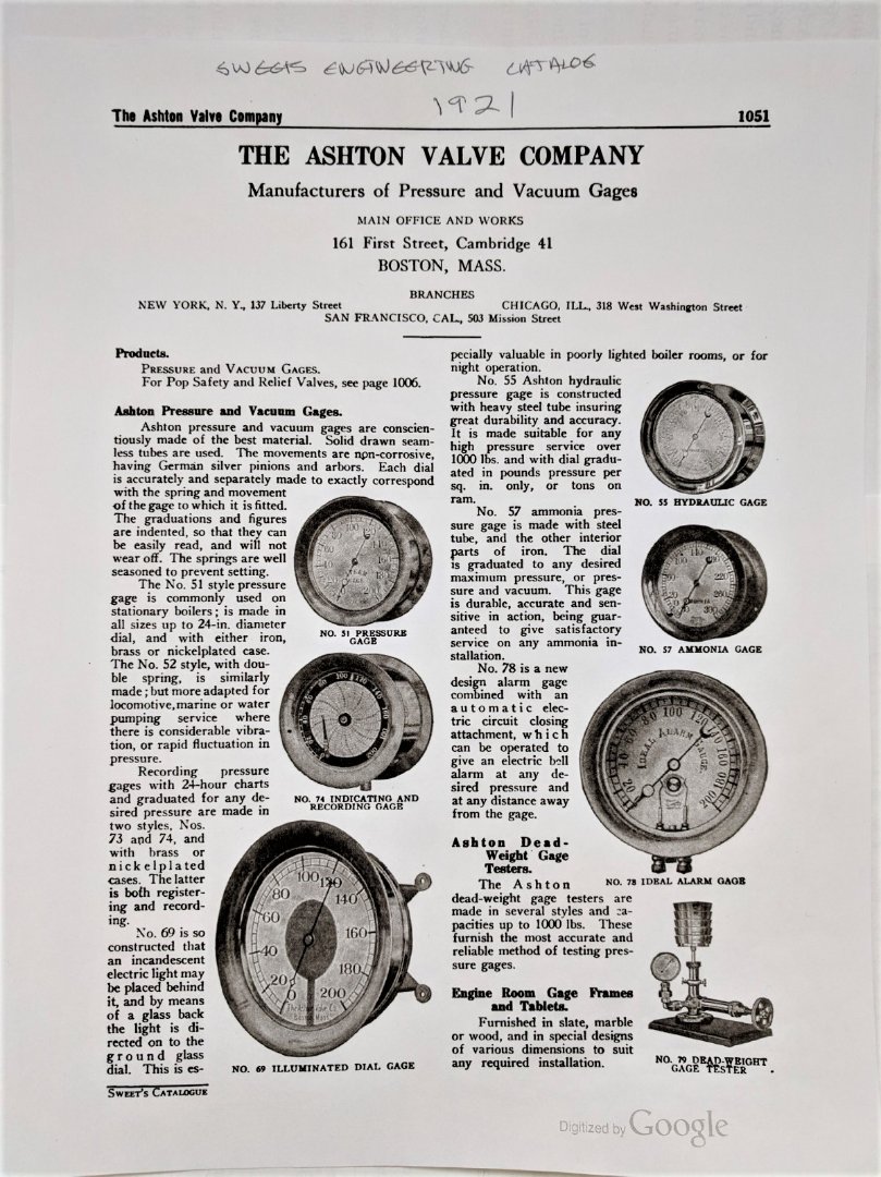 In 1892 Ashton bought out the Boston Steam Gauge company and entered the steam gauge market. The Ashton Valve company is more known today for the gauges than the safety valves that made the company initially famous.