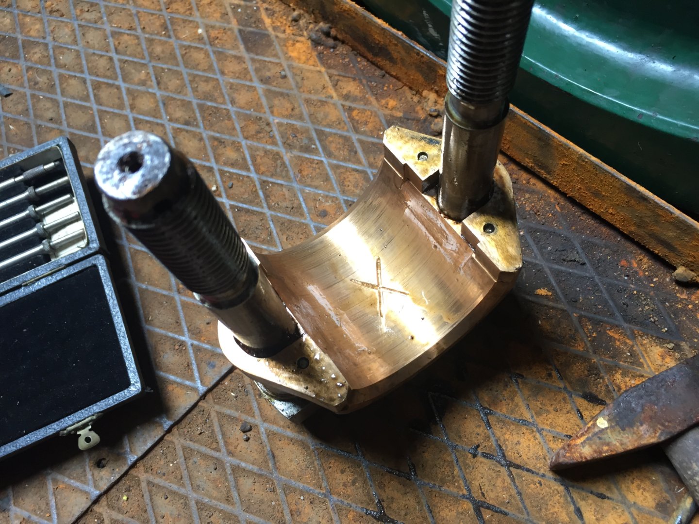 The consensus now is to remove around 0.012" from the slippers and insert a 0.004" shim, with some other thickness's on stand by, re-assemble on the pin with a touch of 'blue' and check for high spots. I have advised that the oil be changed from the current SAE 140 to something a bit thinner, at least at the start.