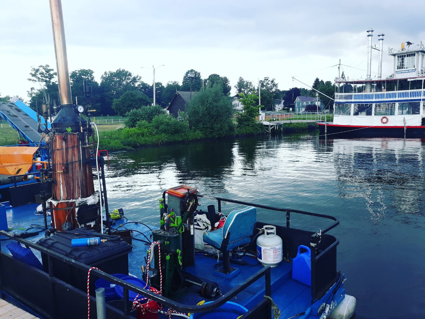 Steamed from Mayville Public boat ramp to home port at Point Chautauqua on Lake Chautauqua in western New York state today after trailering 3hrs from Ohio. Next to me in the background is the Chautauqua Belle a paddle steamer.