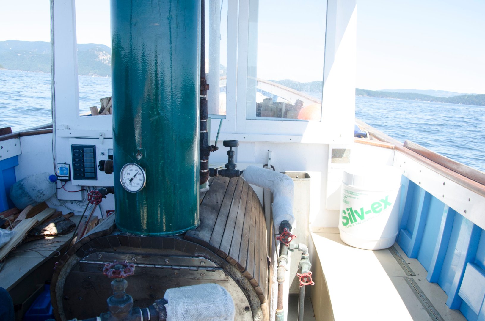 Back when Rainbow was in the water, one of the more difficult/risky tasks while steaming single handed was going forward, around the windshield and fishing a five gallon ( 40 lbs) water container out of the forward hatch and bringing back to the cockpit and pouring it into the hotwell. Here you can see one of the water containers, and the previous hotwell:
