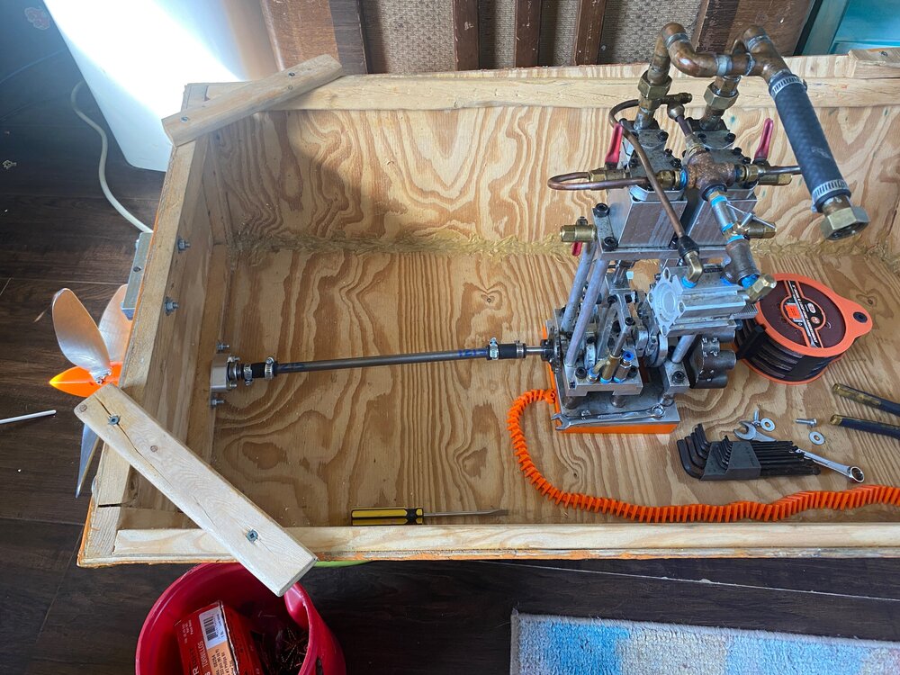 Everything barely fits, but this hull just does not have the displacement for all the weight. Measuring the displacement in CAD put the water line way too high to be comfortable in anything but glass still waters. At least it was fun to put together. I did do a quick steam test yesterday sitting in it and it ended up burning off the first half foot of cotton insulation between the superheater and the engine. However the o-ring on the engine water pump failed, so I have to figure out why and how to make that not happen again. In any case, it was fun putting it all together, and it helped me make sure I had all the required systems set up and working.