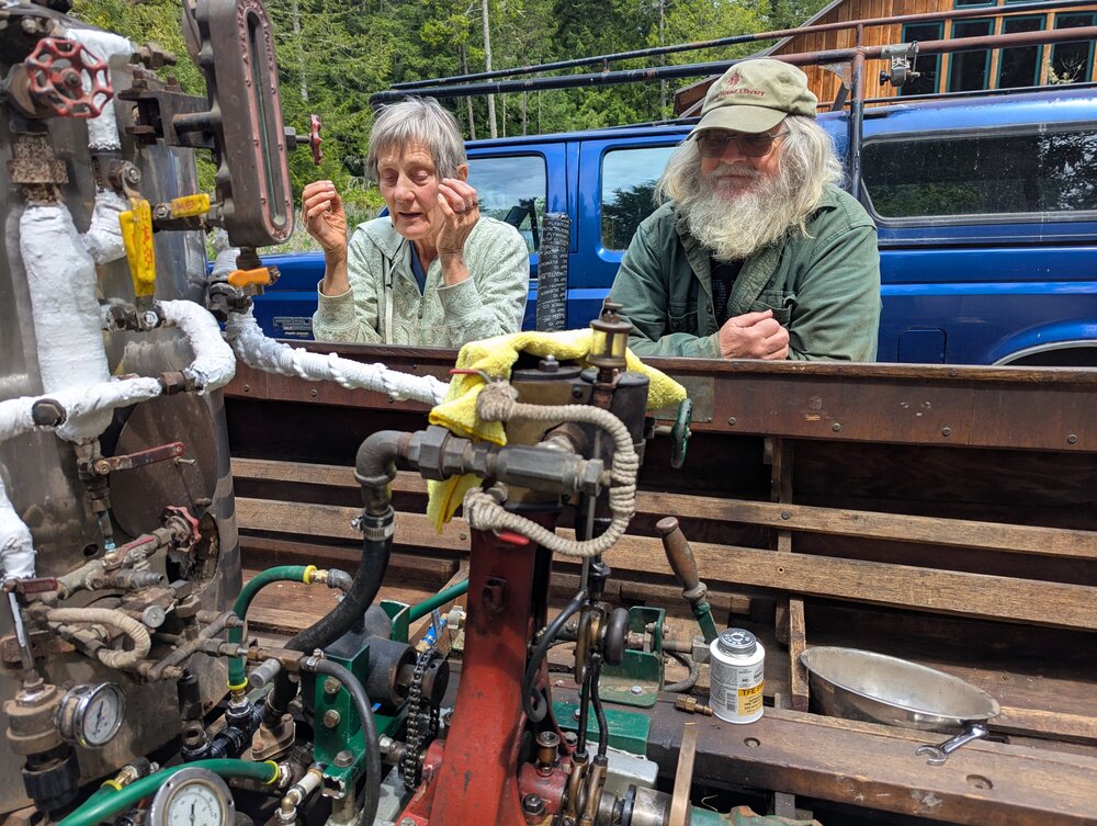She's still in need of more work, but I've taken several weekends off my shop project to get Otter running so that will wait until I can use some machine tools and don't have to work outside. Here's a photo of Stephanie (owner of Uno, a local steamboat from 1894) and I peering at Otter's new plumbing:
