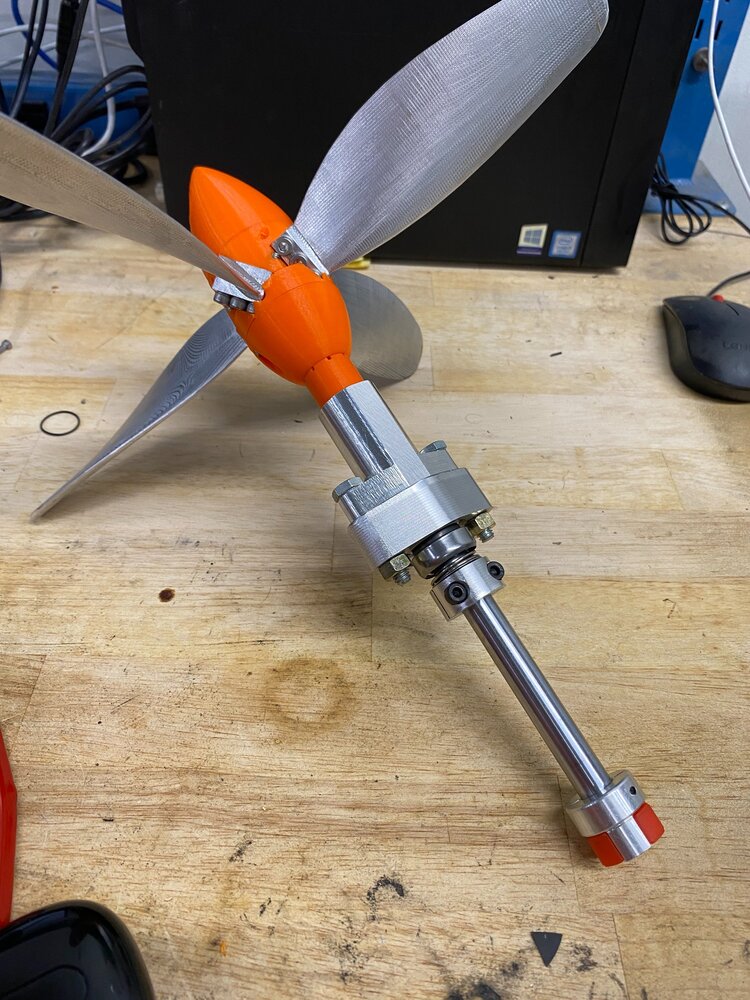 Yeah, the hub is currently PLA, as I haven't had a chance to machine one out of aluminum yet. It's a pain to drill and tap those angled holes so far deep past the rest of the part, I really only use stub drills and I don't have any extended length taps. On the 2 blade hub I actually drilled and tapped those holes from underneath. However the PLA should hold up to the low forces (<50lbf 300rpm) anyways, especially since the forces work to push the blade mounting points into the hub. If it was machined plastic I would trust it 100% after all at these forces.
