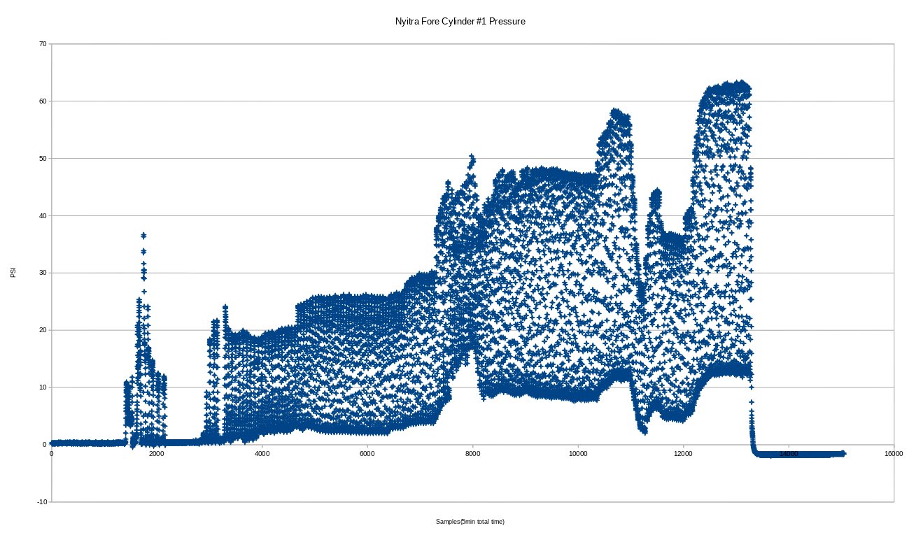This graph shows 27minutes, this is the second sensor that is recording the boiler pressure. I am partially doing this to confirm that the engine cylinder pressure never exceeds the boiler pressure.