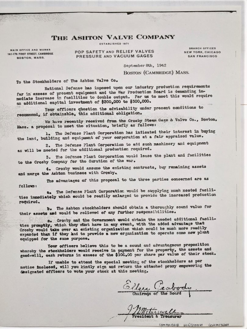 out of the Ashton building in Cambridge. When the war ended in 1945, Ashton Valve was sold to Dewey Stone, who