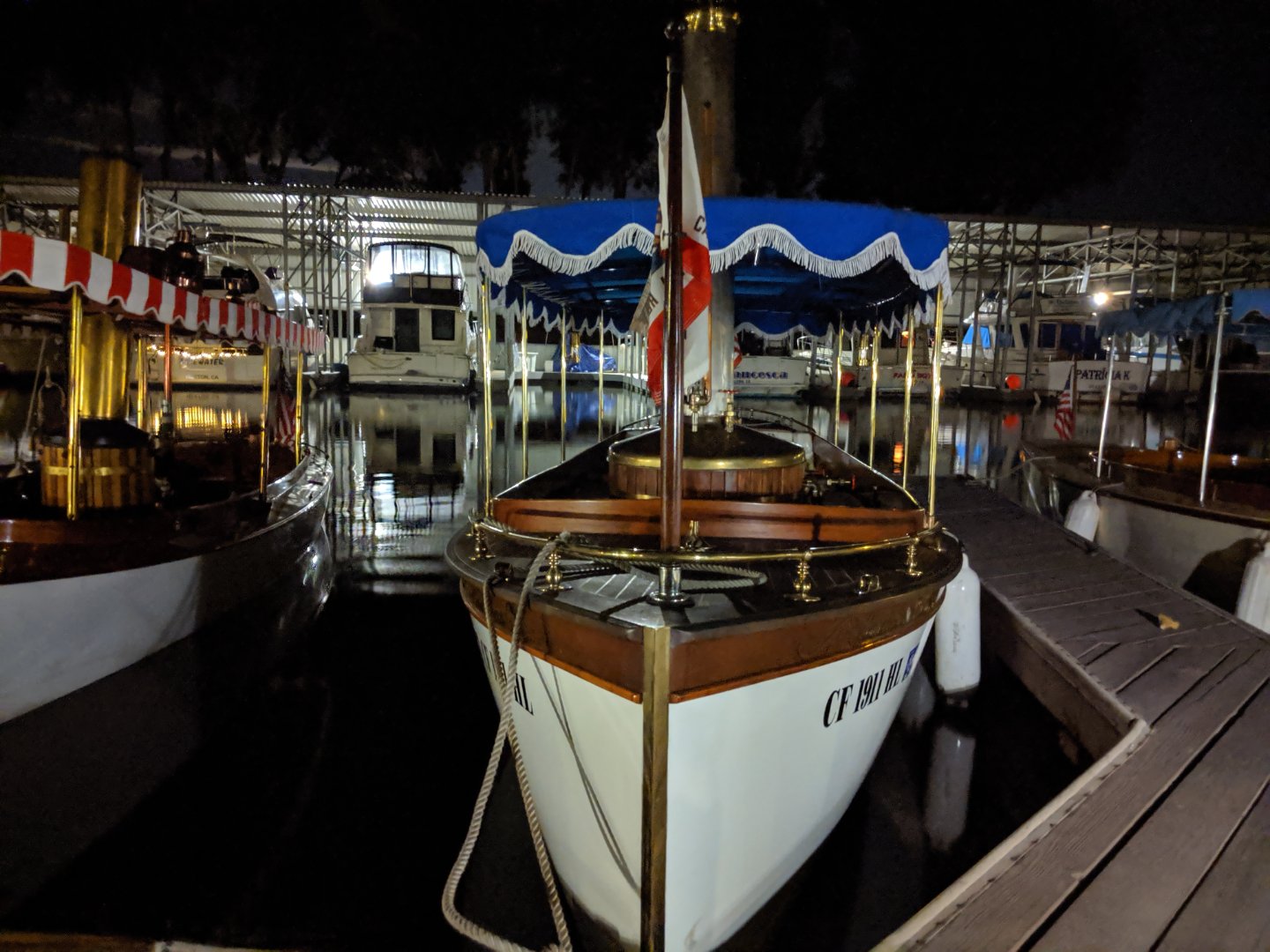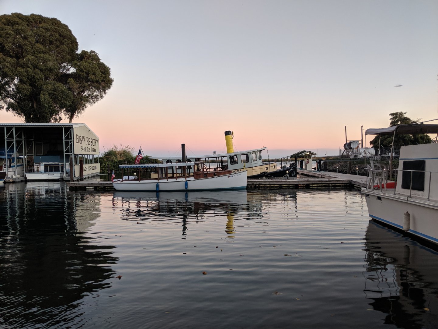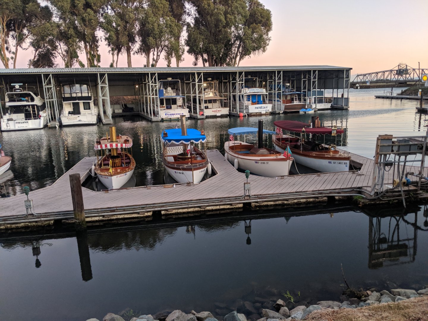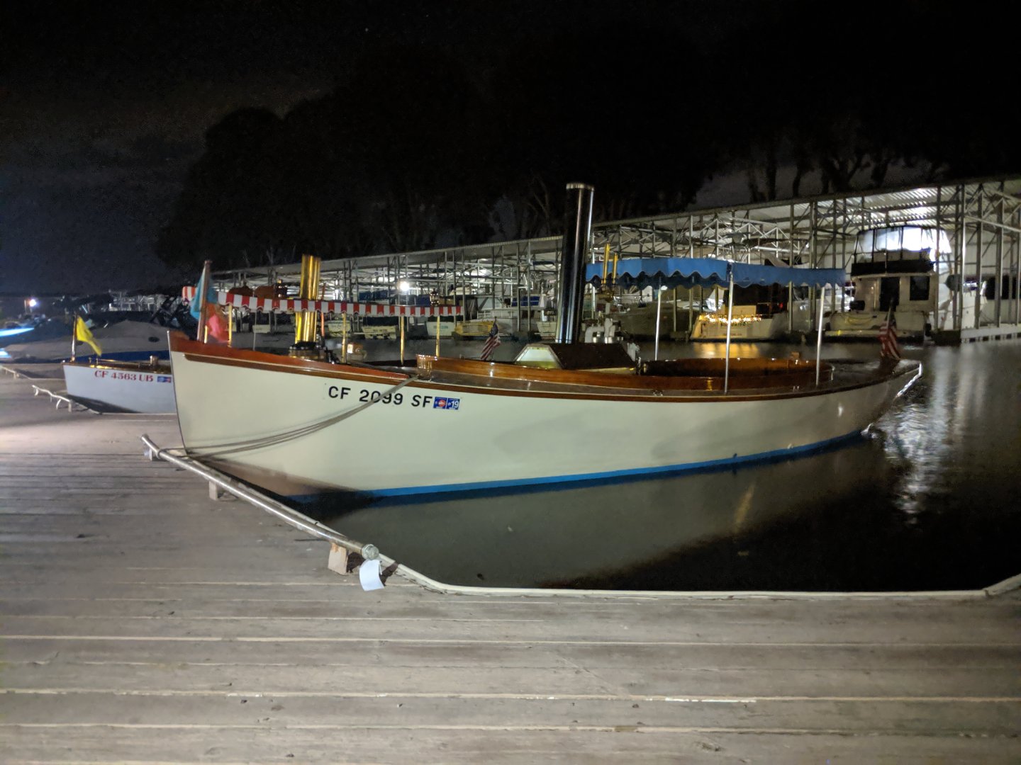 Saturday was spent steaming to the picnic at Westgate Landing Park where folks ate in their little groups at the picnic tables. After steaming back there was a little swap meet, and then folks cooked up their masterpieces for the potluck dinner. A couple of the more adventurous boats went out after dinner for an after dark steam up Georgianna Slough in the starlight.