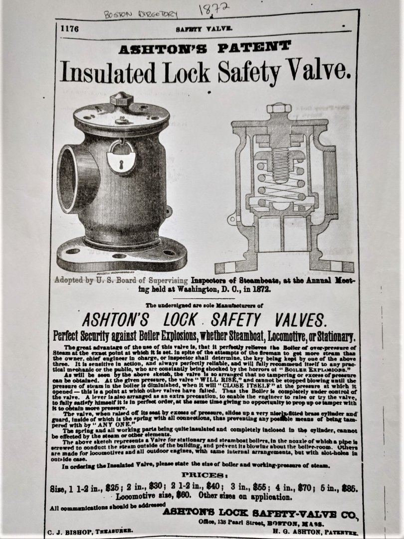 The Ashton Valve company first became well known after Henry G Ashton introduced his pop safety valve in 1872. Attached are adverts and other information about the pop safety valve.