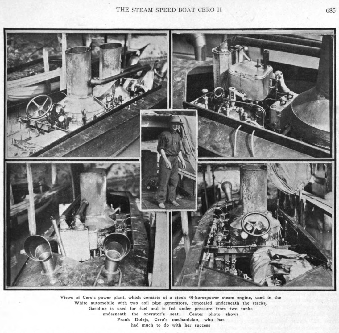 It seems in 1911 steam launches were still holding their own against the onslaught of the infernal combustion engine. This is the Cero II, built by Robert Deming of Cleveland, Ohio. She dominated a lot of races in the Great Lakes/Midwest region with some spectacular results. Supposedly even setting a speed record for a boat of that length in the US. Unofficially she was clocked running a measured mile at 1:32 which is the equivalent of 39.13 miles per hour. Officially, she was timed many times at under 1:40.