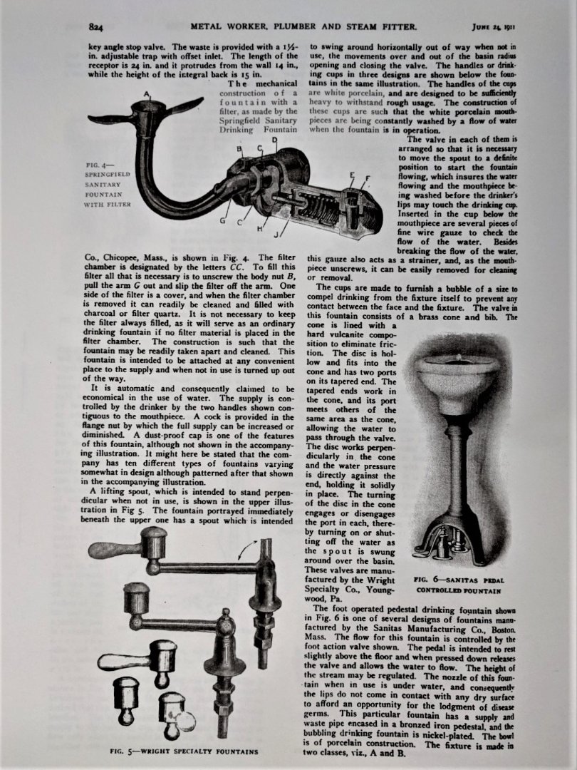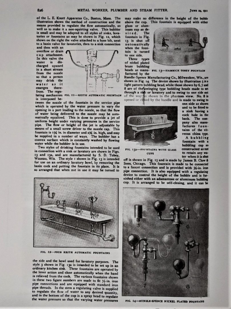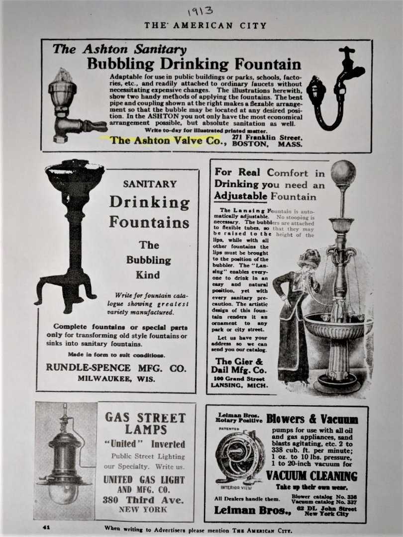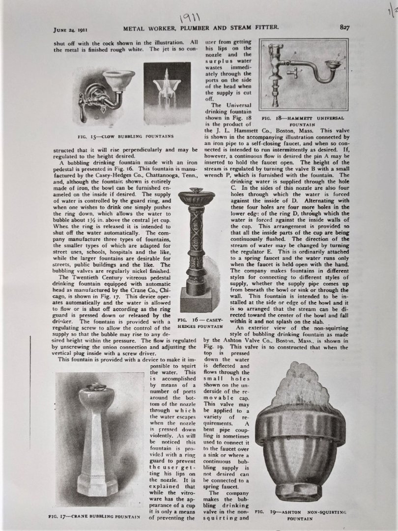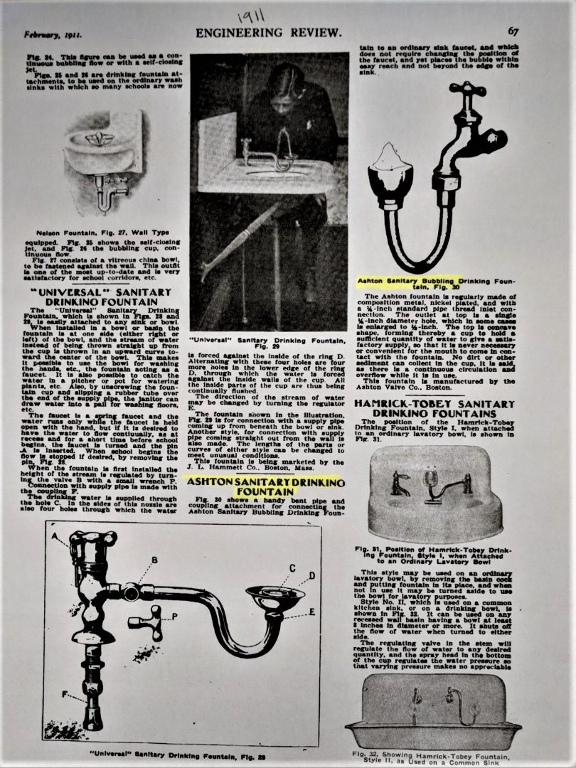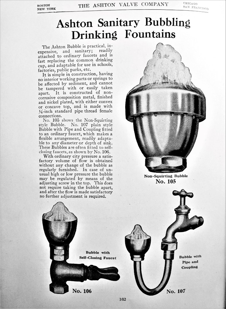 At the beginning of the 20th century people refreshed themselves at public fountains and all drank from the same COMMON CUP, as it was called. Well, sickness and death soon followed and Ashton Valve soon had their line of sanitary bubblers on the market.