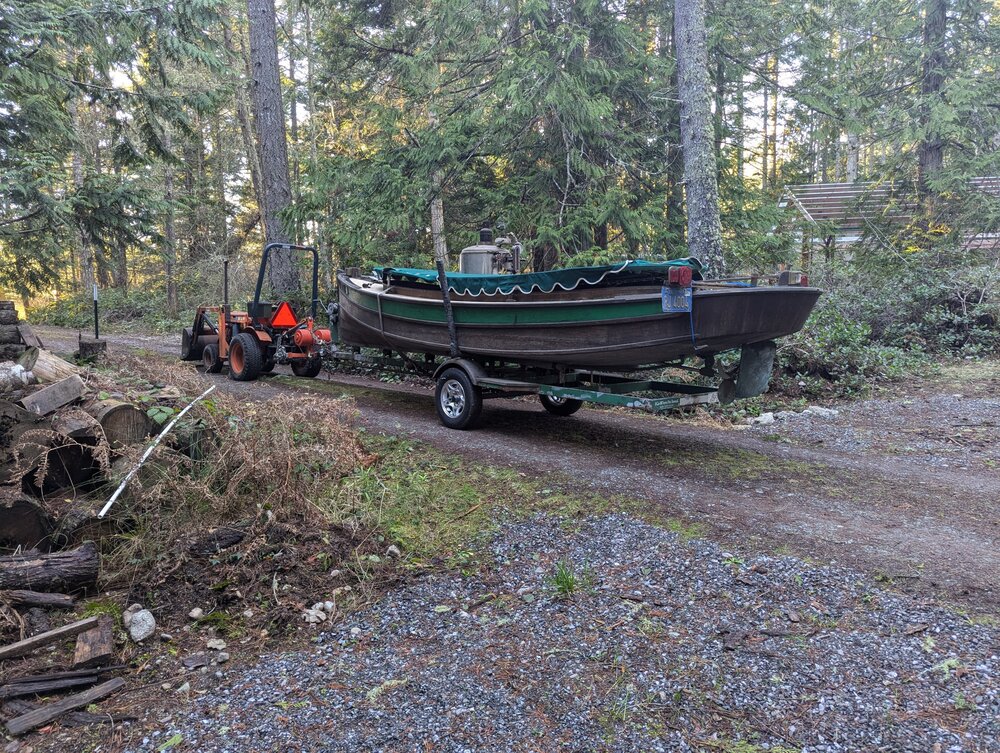 I had decided to renew the running gear on the the trailer, since it had been sitting for years and I was completely uninterested in tire/bearing trouble on the drive north. With new wheels & tires, bearings and hubs, and another good scrubbing on the outside of the boat, we headed north. The trip was without incident, thankfully, and the mild winter weather over the mountain passes made things simpler. An evening ferry ride later, we managed to reach our house, and this weekend I used our little Kubota to squeeze Otter under shelter before it rained again.SL Otter finally moved to Lopez Island