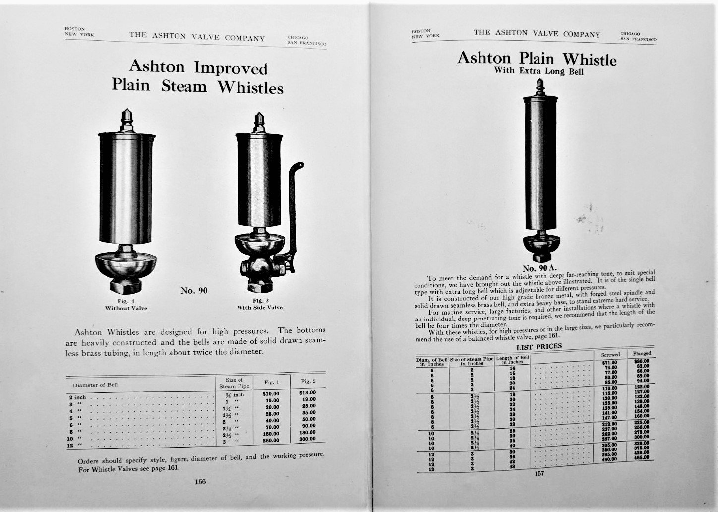 Steam whistles were also produced by the company for marine ships, Locomotive, and stationary boilers.